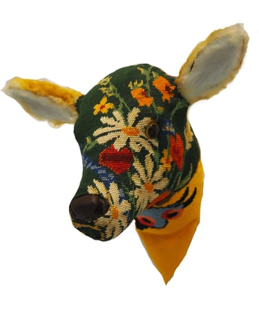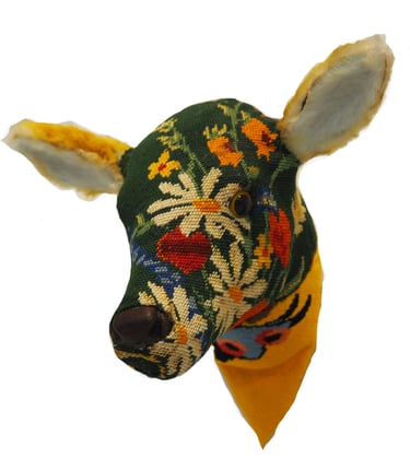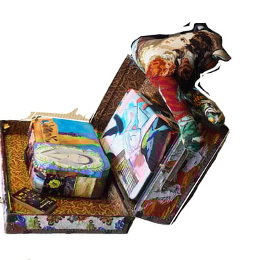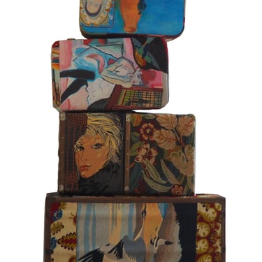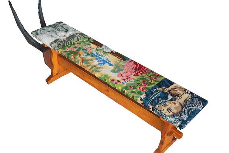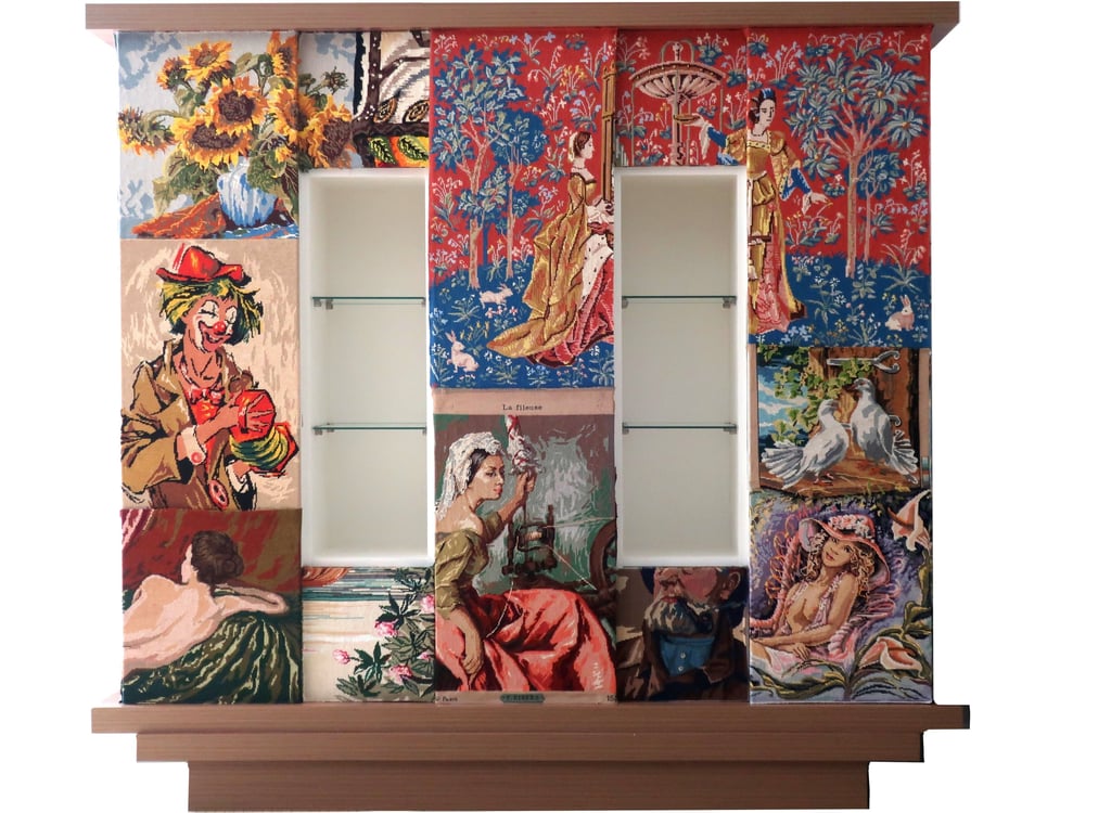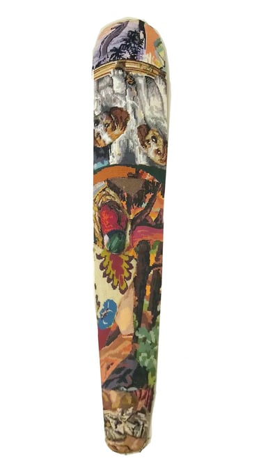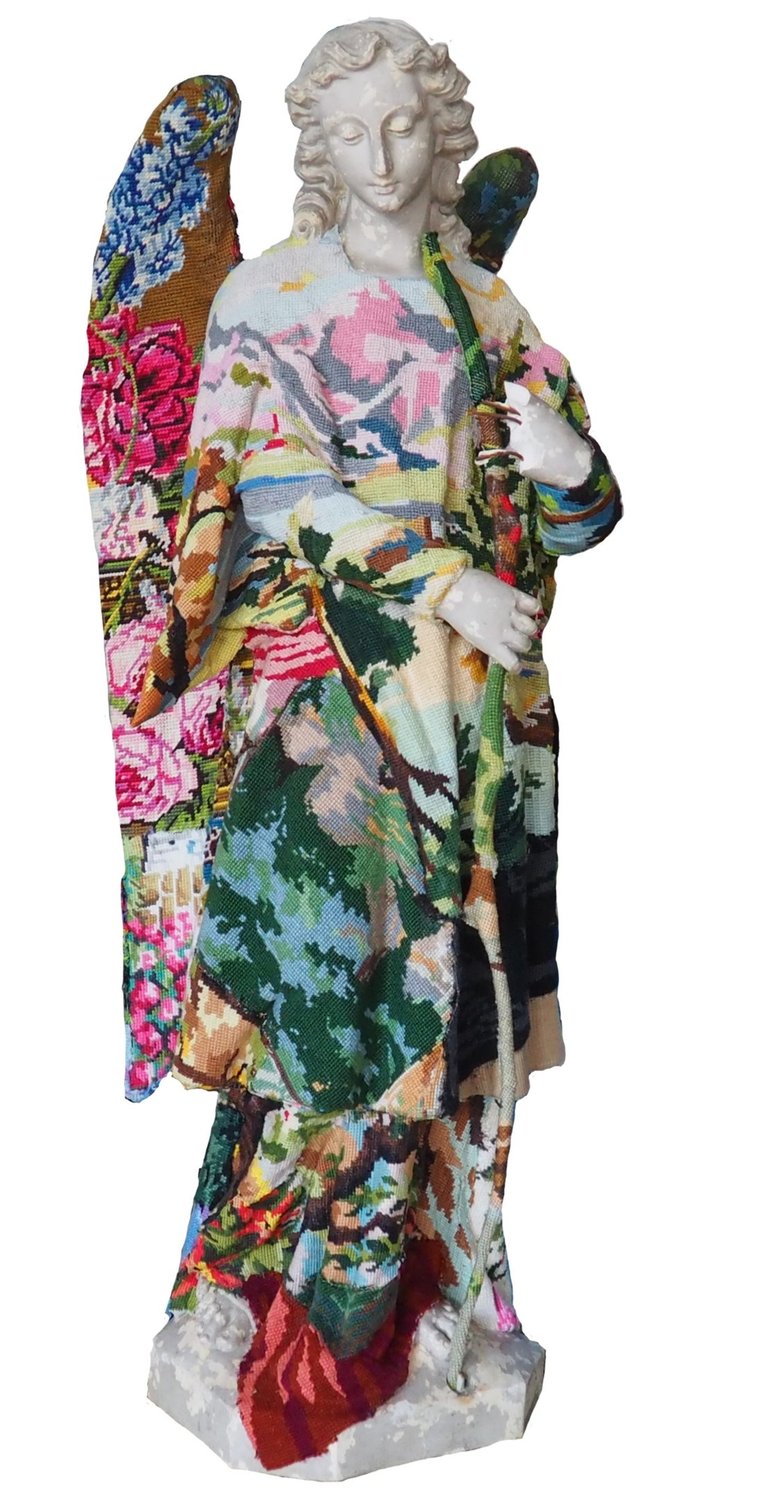Ainsi, dans cette série, Christelle Rodrigues utilise des pièces de couture issues de grosses toiles servant de support pour les tapisseries à l'aiguille. A partir de pièces d'origines variées, dont des canevas des années 1950 aux années 2000, elle façonne des sculptures qui racontent une histoire. Une chaise d'enfant, des masques africains, une malle de voyage, des valises ou autres objets anciens sont enveloppés dans la toile permettant la liaison des images et de la création d'histoires singulières véhiculant des souvenirs et des émotions. Le réseau des significations est riche. Le regardeur tisse sa propre interprétation grâce à l'impulsion donnée par les morceaux épars liés par la coupure-couture.